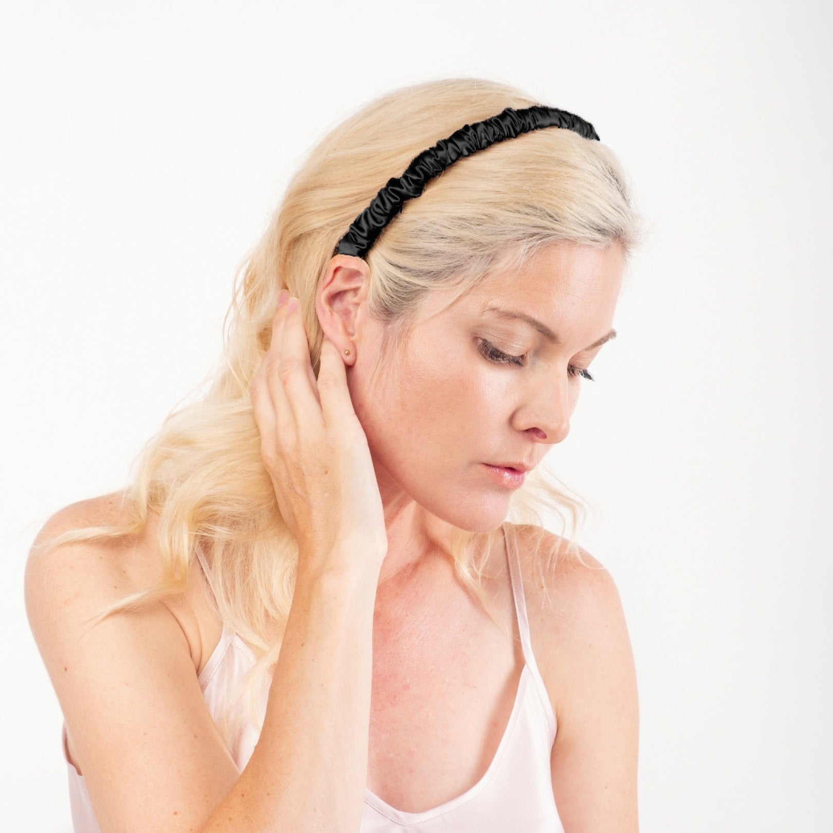 - This headband made from high quality flexible plastic wrapped in 100% pure mulberry silk. Silk hairband can reduce hair breakages, minimizes dents in the hair compared to those made of cotton.