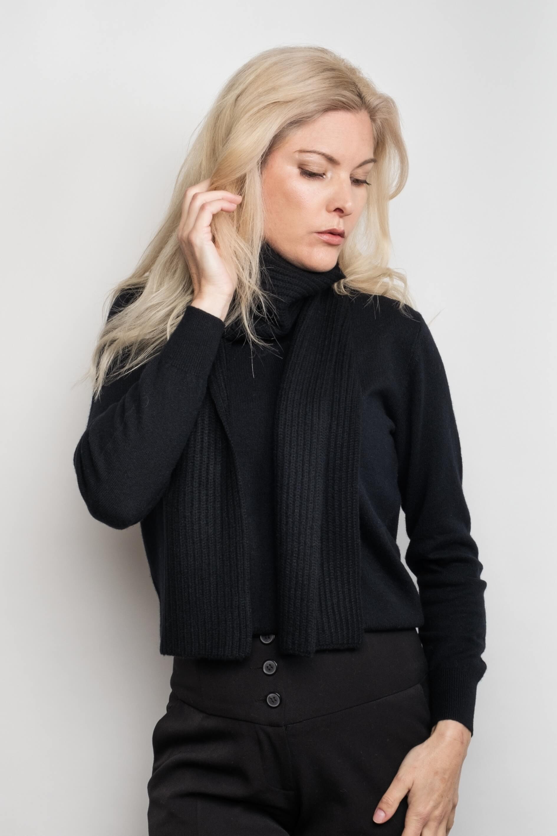 Meticulously crafted with a fine ribbed knit, this scarf provides a luxuriously soft texture, perfect for the style-conscious individual. Its slender, elongated design and the subtle elegance of its weave make it a timeless and essential addition to any wardrobe.
