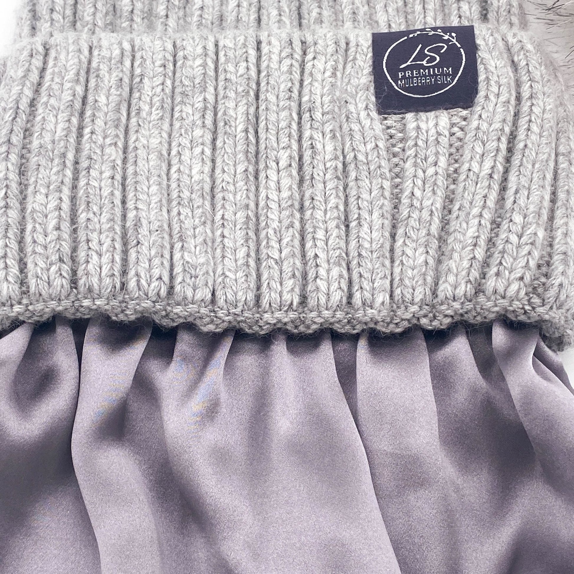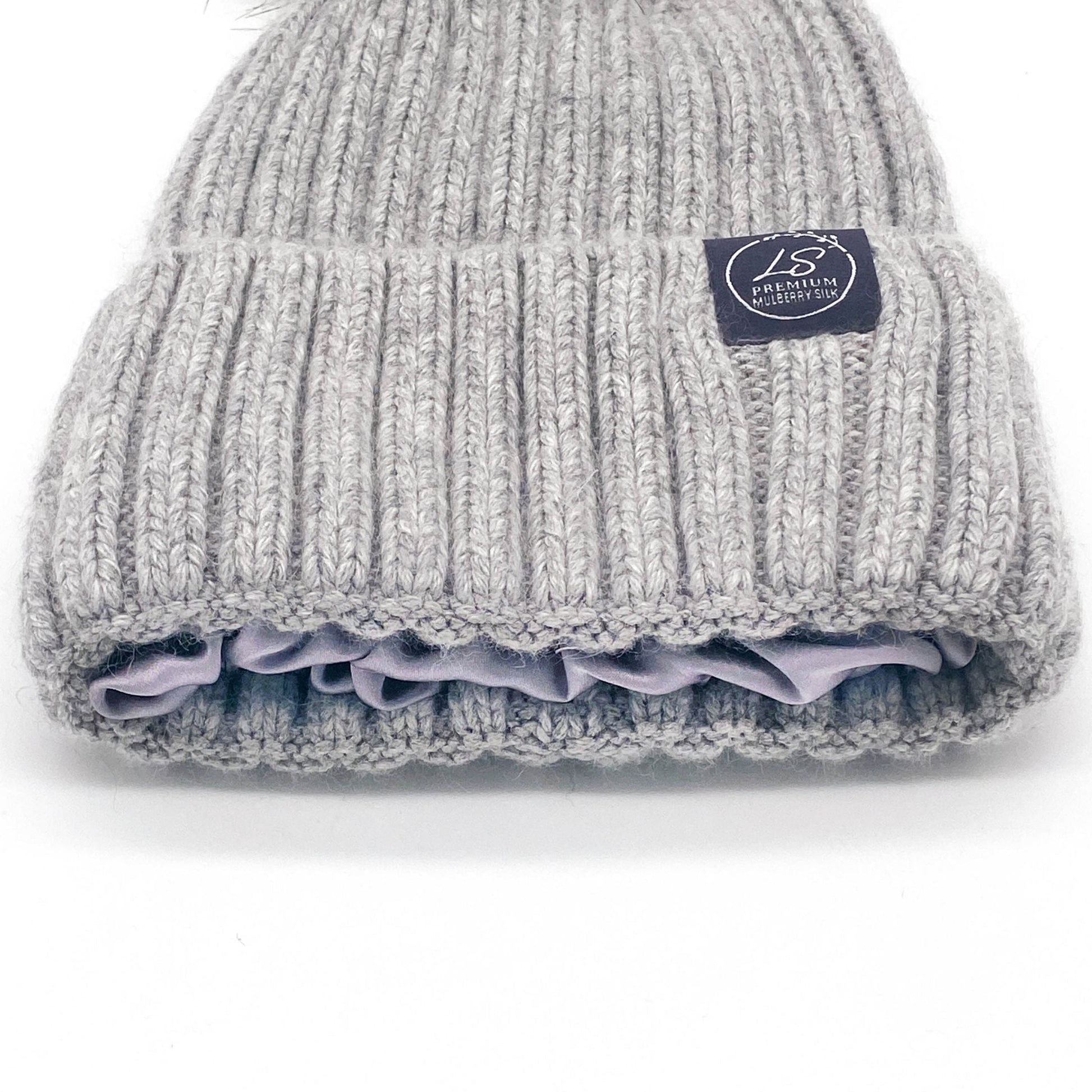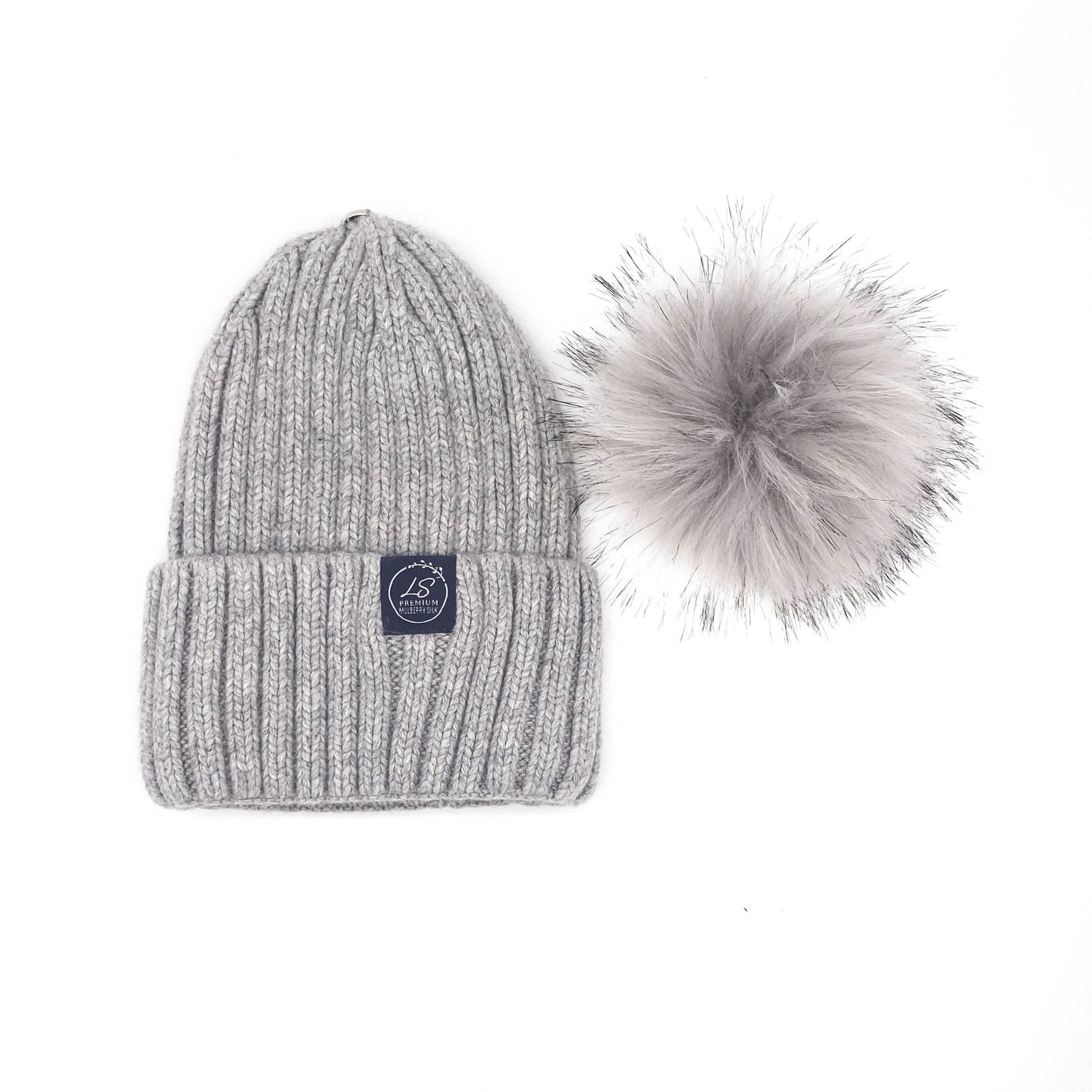 Mulberry Silk-Lined Classic Ribbed Beanie Hat – Cashmere Blend with Removable Pom Pom - Grey