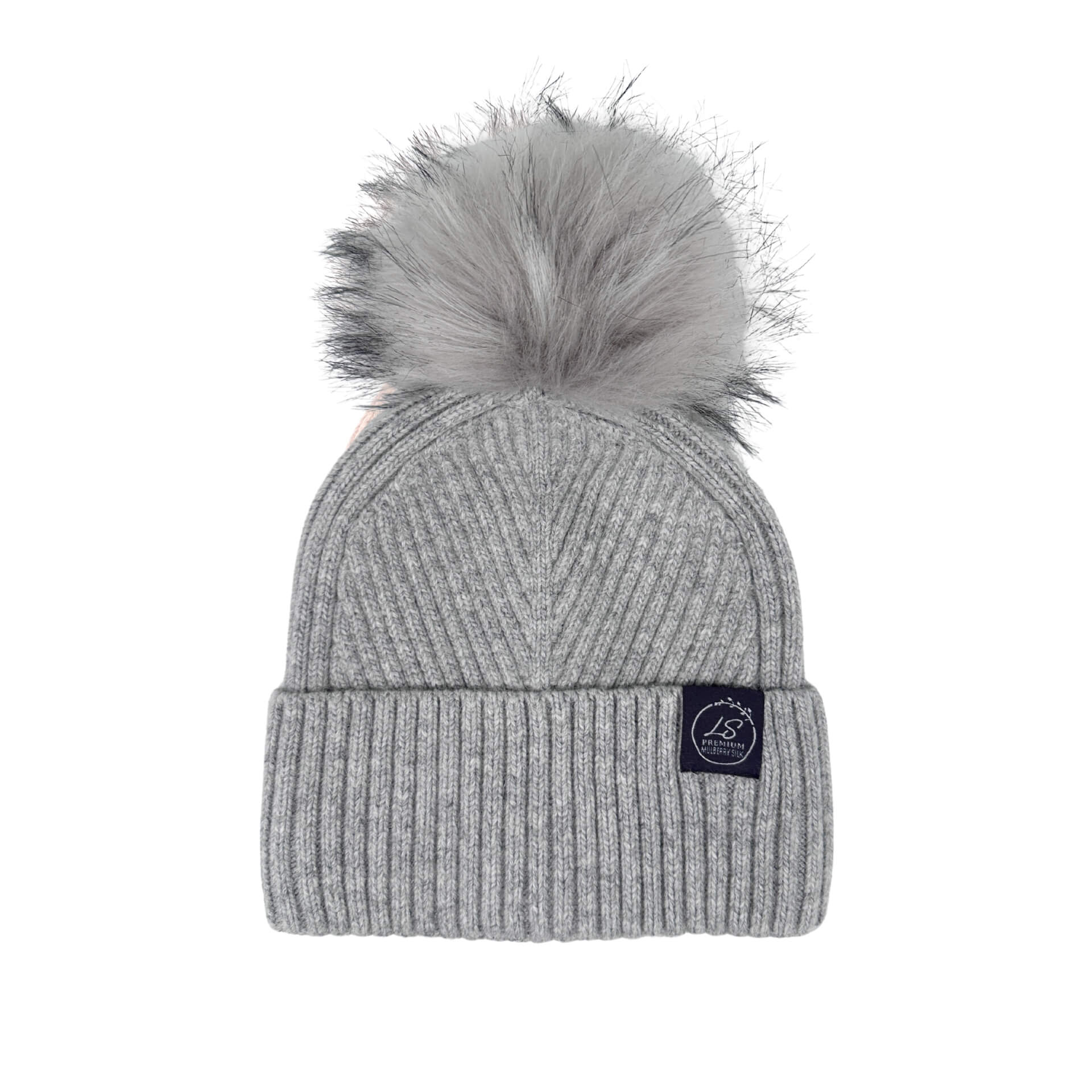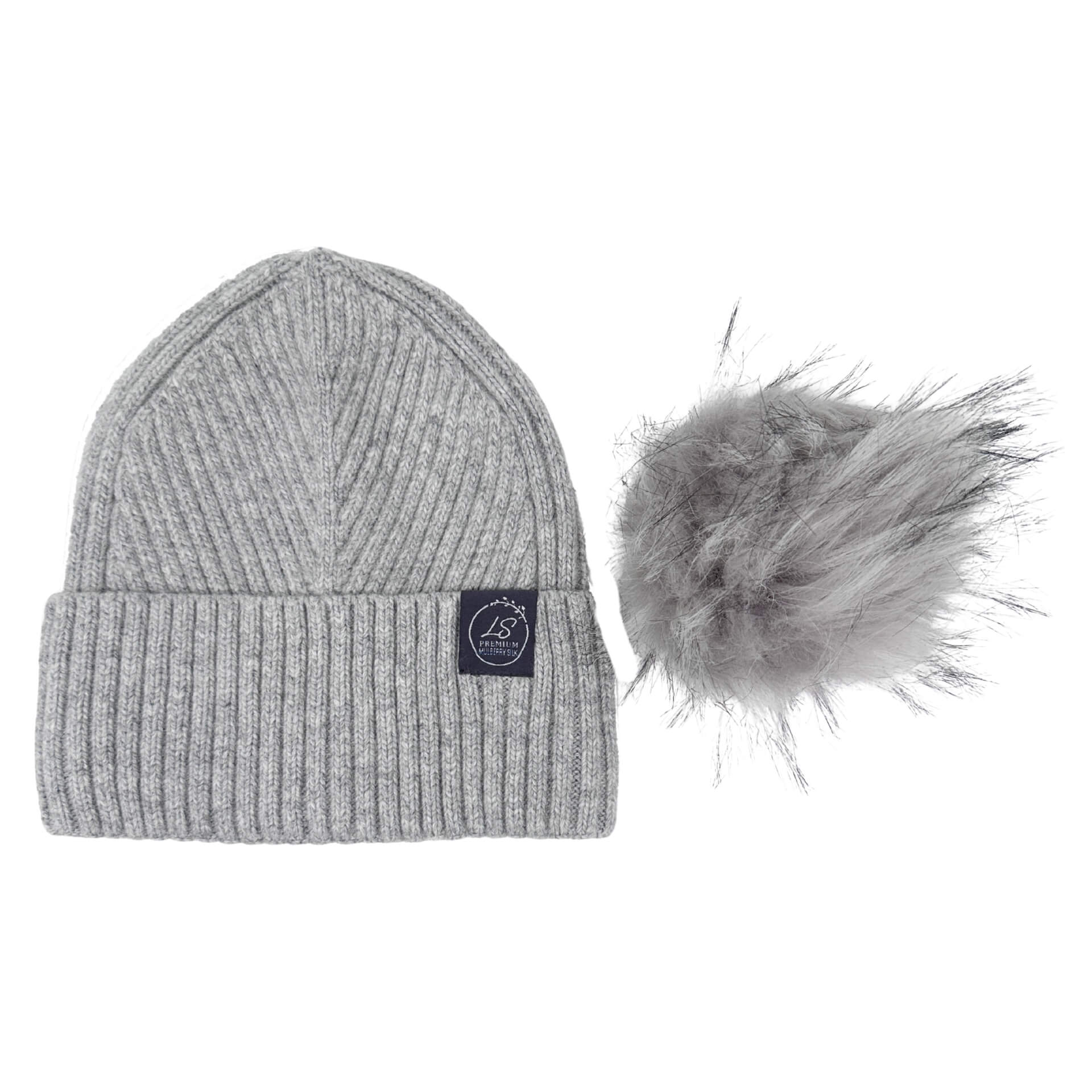 Mulberry Silk-Lined Slim Ribbed Beanie – Cashmere Blend with Removable Pom Pom -Grey